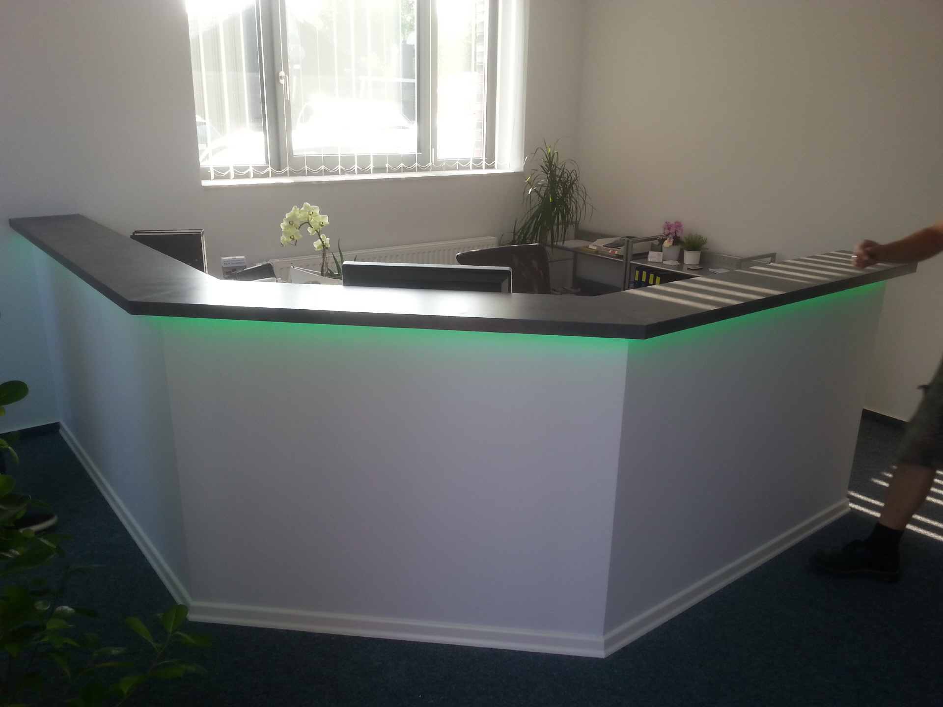 Tresen im Empfangsraum mit sämtlichen Anschlüssen und indirekter Beleuchtung.